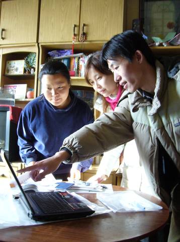 華碩工程師向天津的受捐助對象貧困母親嚴(yán)蓉捐贈筆記本電腦,并為她講解電腦的使用
