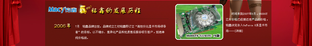 銘鑫顯卡隸屬于科正達(dá)(香港)電子有限公司。成立于成立于公元1999年,是一家深港合資從事計算機(jī)圖形卡類產(chǎn)品的研發(fā)和渠道銷售的專業(yè)計算機(jī)圖形卡廠商。長期以來本公司堅(jiān)持秉承“追求品質(zhì)精良、積極服務(wù)客戶,力創(chuàng)品牌價值”的態(tài)度,通過十余年來堅(jiān)持不懈的努力發(fā)展,本公司已經(jīng)成為擁有強(qiáng)大研發(fā)團(tuán)隊(duì)、并能及時根據(jù)市場需求為客戶研發(fā)一流品質(zhì)、價格實(shí)惠的多種圖形卡產(chǎn)品的方案及通路成品提供商。