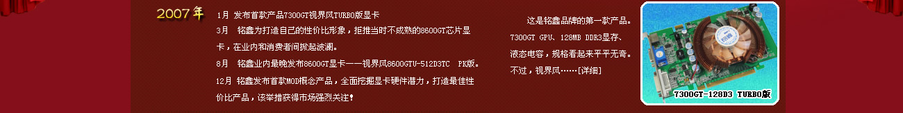 參加型號:銘鑫視界風(fēng)7300GT-128D3 TURBO、銘鑫視界風(fēng)7600GT-256D3 ULTRA版 、銘鑫視界風(fēng)8600GTU-256D3 PK版。